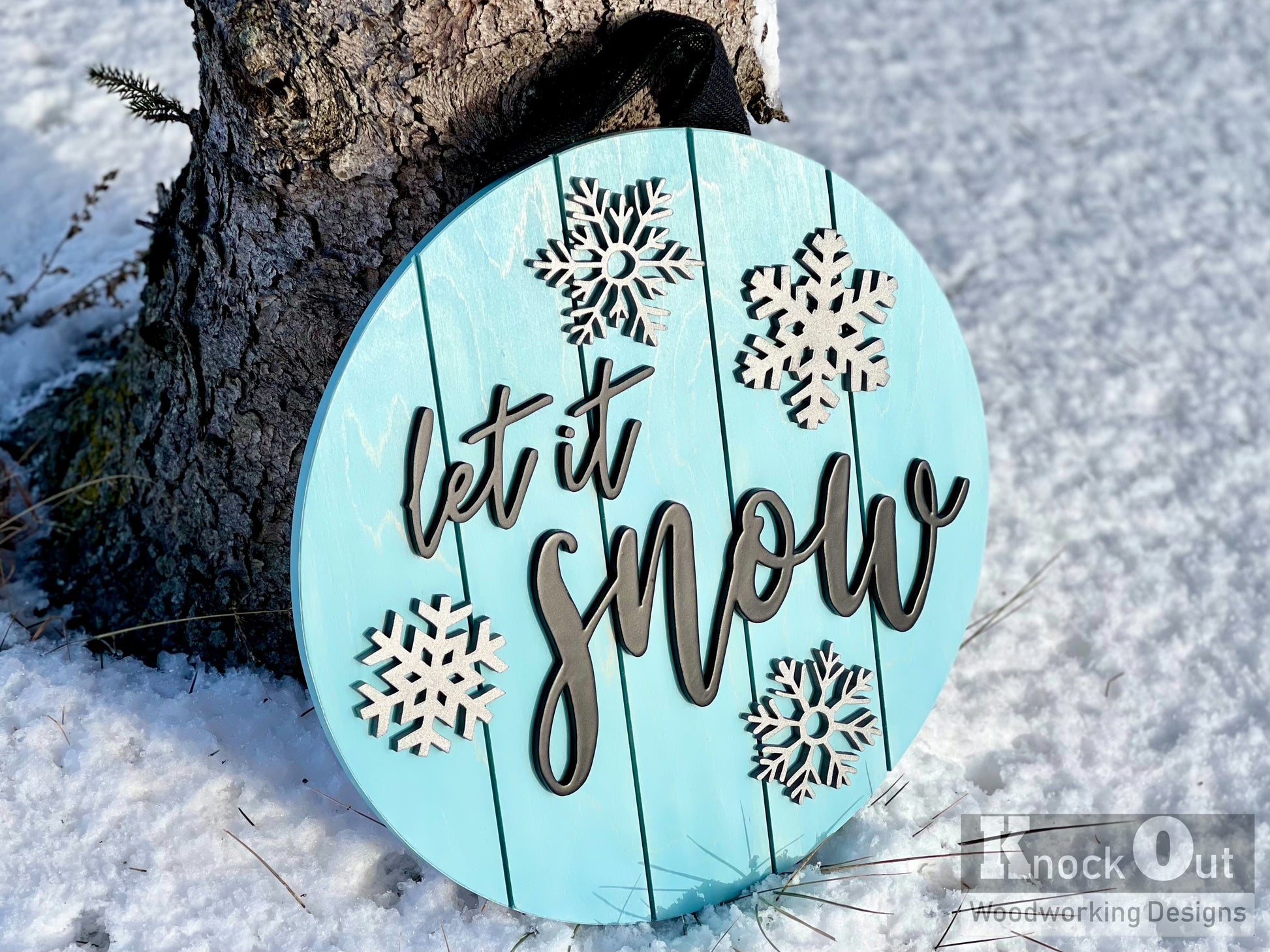 3D sign on 18in stained backer with edge banding and hand cut snowflake detail. 2-4 weeks.