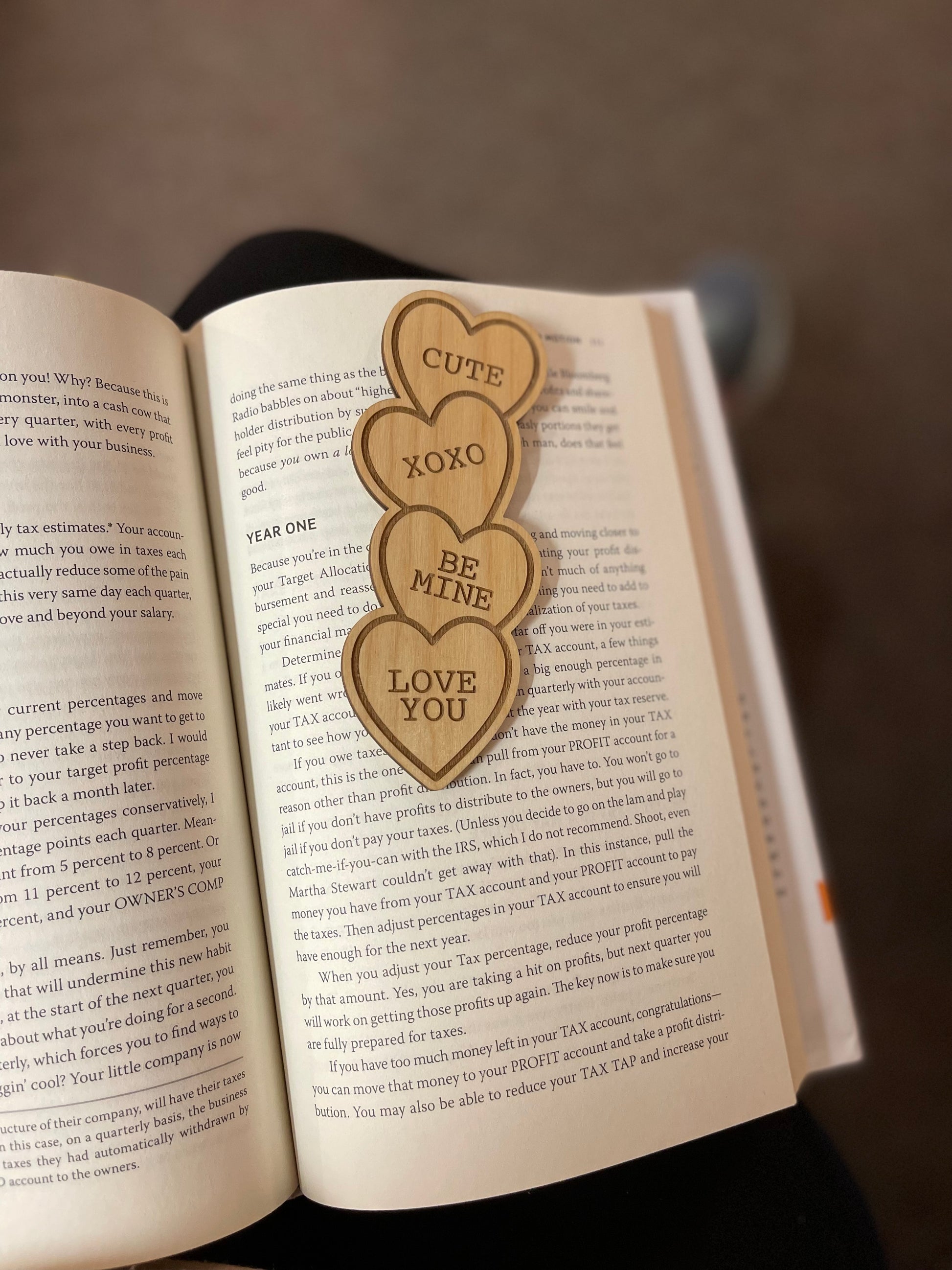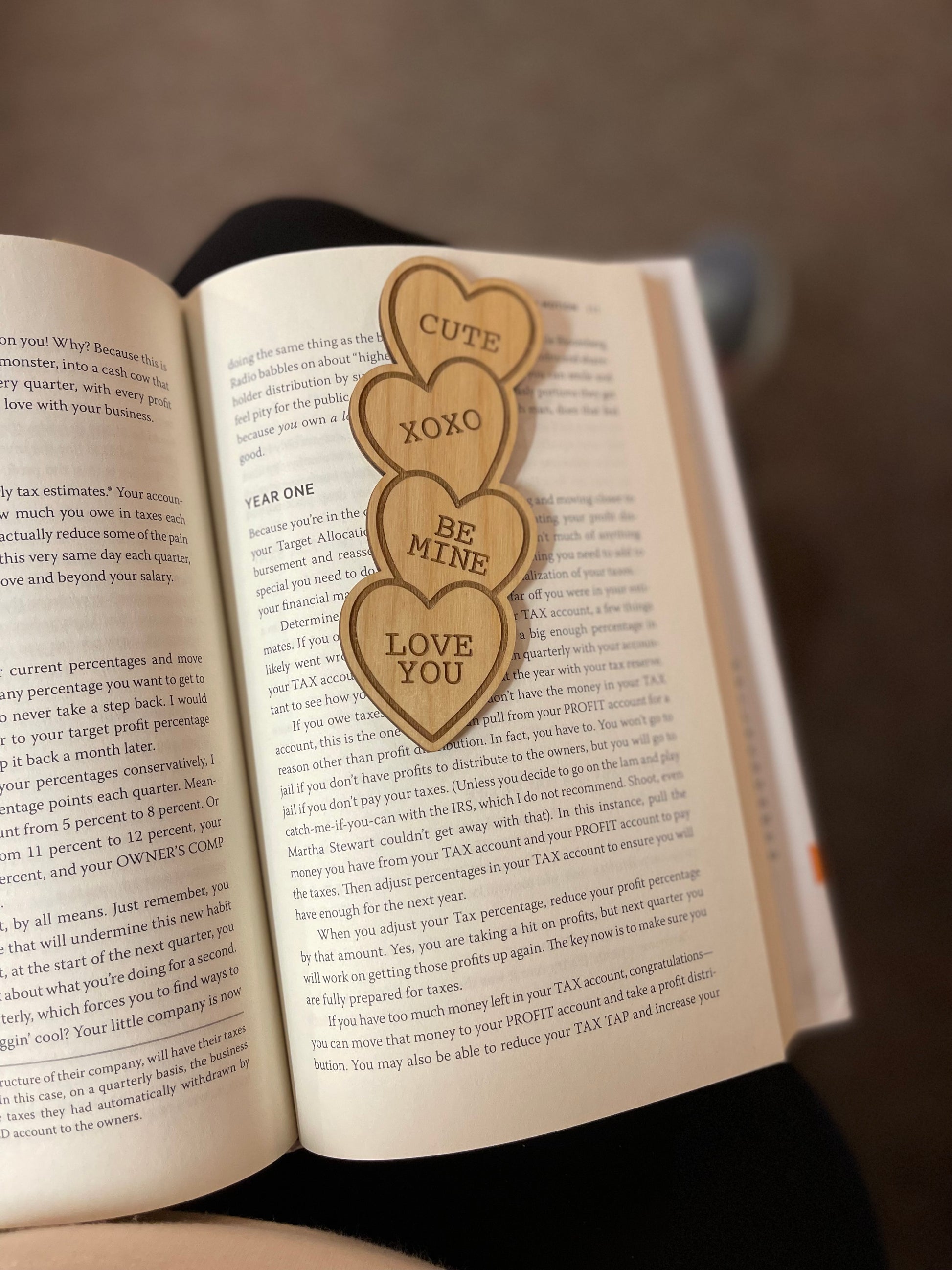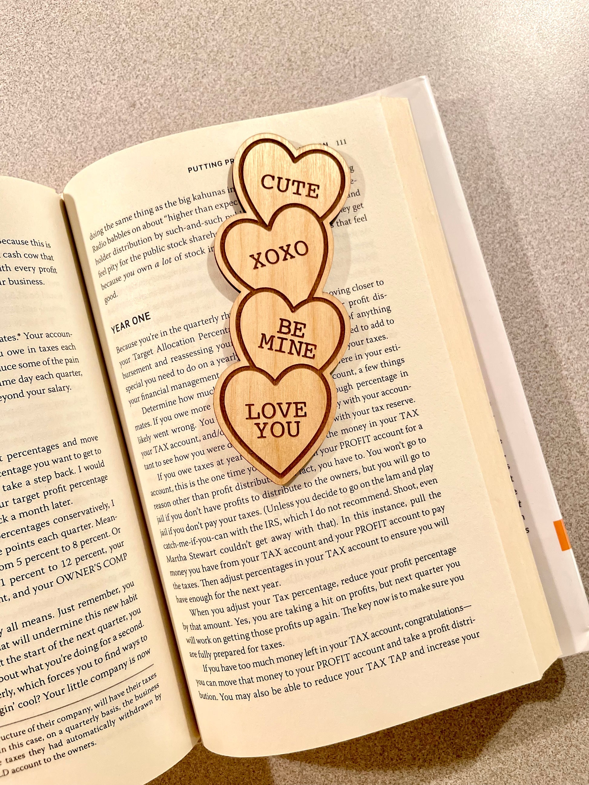 1/8” wood bookmark engraved with conversation style hearts.